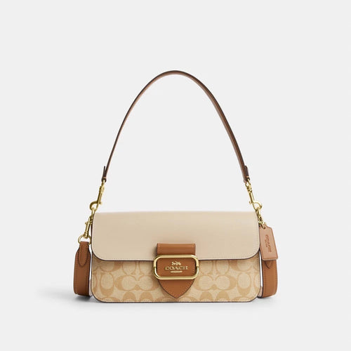 The Coach Morgan Shoulder Bag is precisely crafted from signature coated canvas complemented by refined calf leather, exuding a premium feel and durable quality. The elegant light khaki and khaki multi-tone block designs are versatile for any outfit and occasion, seamlessly transitioning from day to evening wear.
